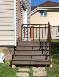 VIP-предложение Ступени лестницы и покрытие самого крыльца выполнено террасной доски- ДПК. Перила могут быть простые или содержать элементы ковки.